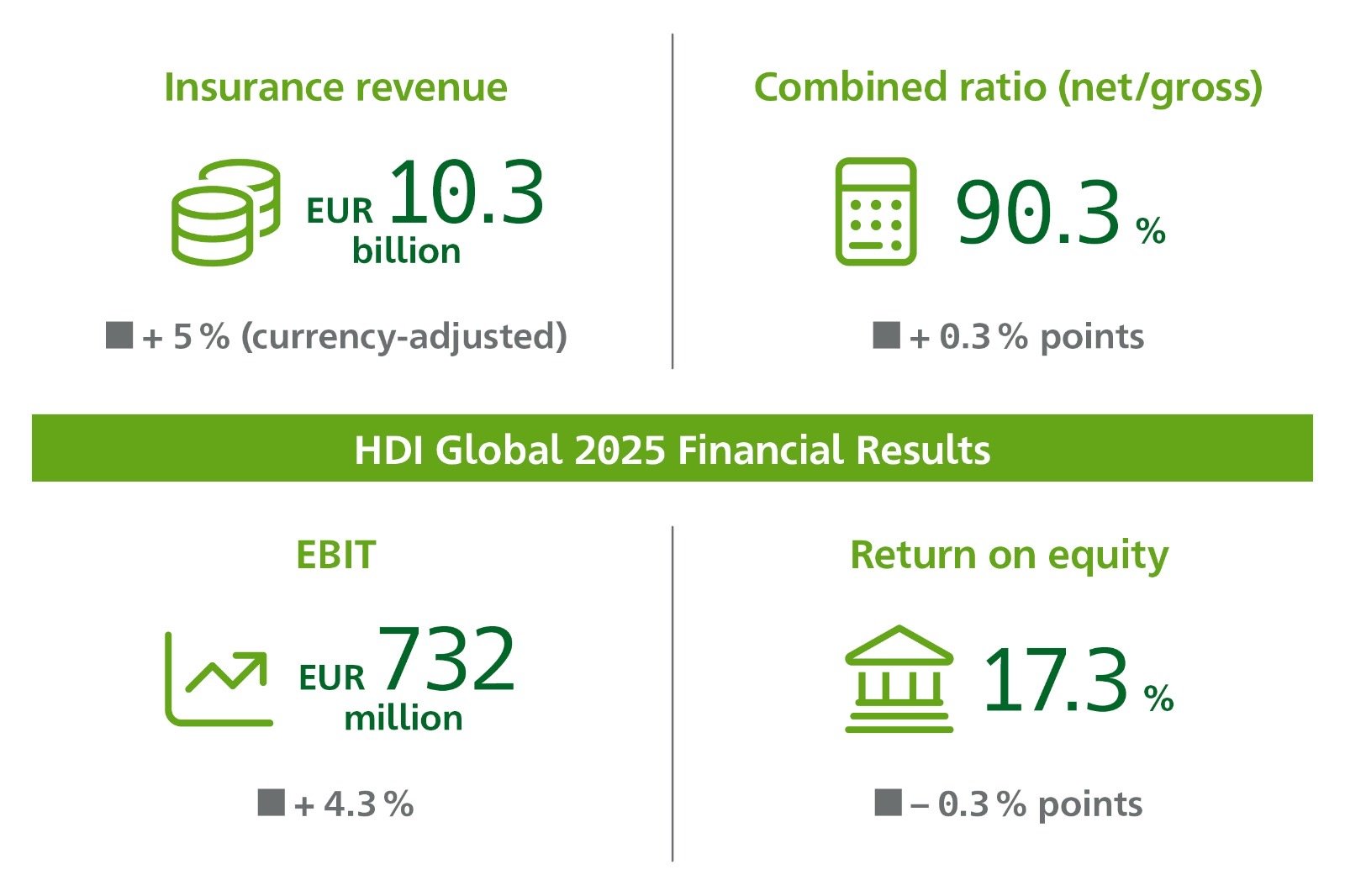 وعلى المستوى العالمي، سجلت “إتش دي آي جلوبال” نمواً في إيرادات التأمين خلال السنة المالية 2025 بنسبة 5٪ بعد تعديلها لتأثيرات تقلبات العملة (بنسبة 2٪ باليورو)، لتصل إلى 10.3 مليار يورو (مقابل 10.0 مليار يورو). وتعزى هذه الزيادة إلى نمو في الأقساط المكتتبة، إلى جانب التعديلات السعرية المرتبطة بالتضخم في محفظة الأعمال القائمة. وارتفعت تعويضات الخسائر الكبرى بشكل طفيف لتصل إلى 426 مليون يورو (مقابل 402 مليون يورو)، إلا أنها بقيت دون المستوى المخصّص لها في الميزانية بفارق 125 مليون يورو. في حين حافظ صافي خدمات التأمين على استقراره عند 997 مليون يورو (مقابل 1,004 ملايين يورو).