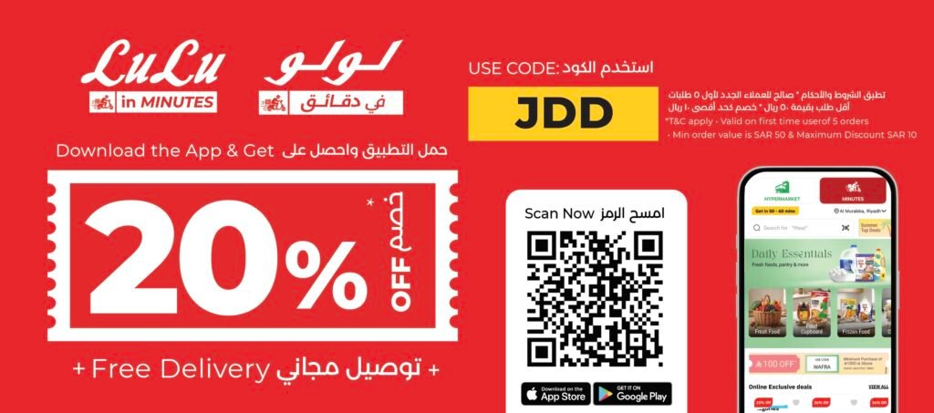 لجعل هذه المرحلة الجديدة من التسوق الإلكتروني مع لولو أكثر فائدة، تقدم لولو مجموعة متنوعة من العروض الحصرية للمتسوقين عبر الإنترنت في جميع فئات المنتجات. يمكن للعملاء الجدد البدء باستخدام الكود JDD للحصول على خصم بقيمة 10 ريال، بينما يمكن للعملاء الحاليين الاستفادة من خصومات متفاوتة مثل RMD للحصول على خصم 25 ريالًا، وBARAKA50 للحصولعلى خصم 50 ريالًا، وWAFRA100 للحصول على خصم 100 ريال. وللاحتياجات الأكبر من التسوق، توفر الأكواد AHLAN وKSA200 خصومات كبيرة بقيمة 150 و200 ريال على التوالي. هذه العروض متاحة على عدة طلبات (باستثناء بطاقات الهدايا)، وهي مصممة لتقديم أقصى قيمة ممكنة مع الاستفادة من كفاءة وسرعة التحديث الجديد.