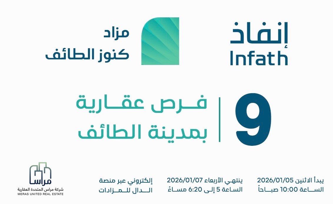 تعلن شركة مراس المتحدة العقارية وبإشراف مركز الإسناد والتصفية «إنفاذ» وبقرار من محكمة التنفيذ ،عن إقامة مزاد “كنوز الطائف” الإلكتروني يبدأ يوم الاثنين 5/1/2026 الساعة 10 صباحاً وينتهي يوم الأربعاء 7/1/2026 من الساعة 5:00 إلى 6:20 إلكترونيًا عبر منصة الدال للمزادات .