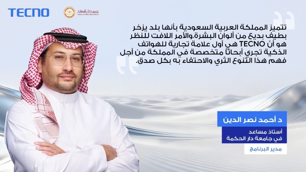 من جانبه، أكد البروفيسور أحمد ناصر الدين من جامعة دار الحكمة أن المملكة تُعد موطناً لتنوع لوني غني، مشيراً إلى أن TECNO هي الشركة الوحيدة التي تجري أبحاثاً ميدانية متخصصة لفهم هذا التنوع، مضيفاً: “نحن فخورون بالمساهمة في مبادرة تعزز تمثيل المجتمع السعودي بدقة في التقنية الحديثة.”